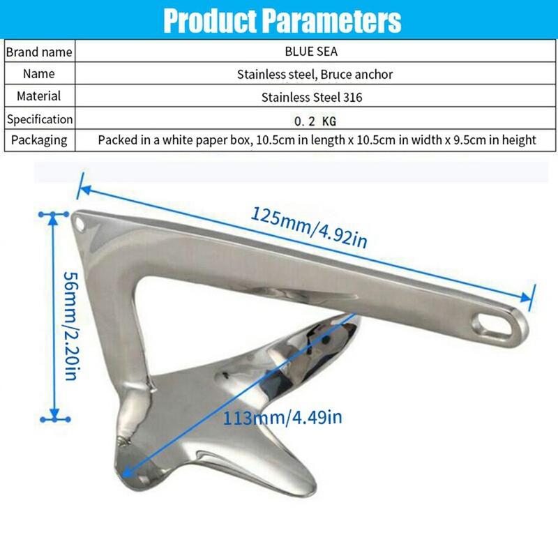 316 Ancoră Bruce din oțel inoxidabil 0,2 kg cu cablu de 5m - ancoră compactă pentru caiac, barcă gonflabilă și ambarcațiuni mici (cârlig de primăvară inclus)