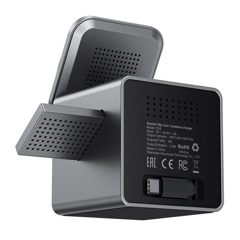 Acefast E34 3-in-1 Stație de încărcare wireless magnetică cu flip electric pentru smartphone, smartwatch și căști - 15W, 5W, 2.5W