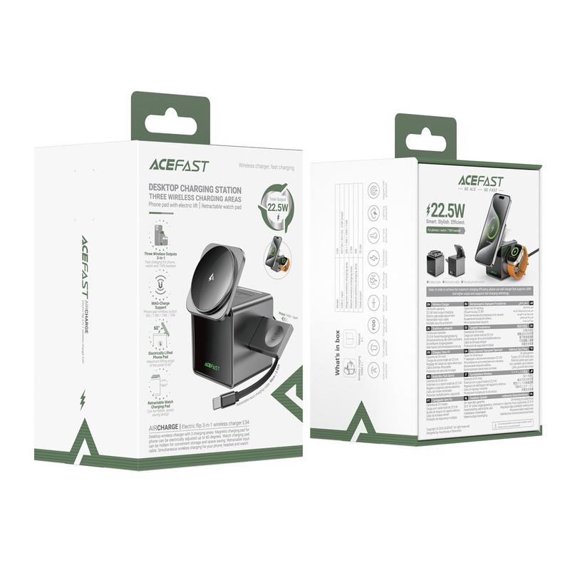 ACEFAST E34 este o stație de încărcare wireless premium 3 în 1 concepută pentru a vă alimenta smartphone-ul, ceasul inteligent și căștile, toate deodată. Cu un suport inovator cu flip electric, vă permite să ajustați unghiul de vizualizare al telefonului în timpul încărcării, făcându-l ideal pentru apeluri video, streaming sau utilizare la birou. Suportând o încărcare rapidă de până la 15W, E34 oferă o putere eficientă, în timp ce răcirea încorporată și gestionarea cablurilor retractabile vă mențin spațiul de lucru ordonat și sigur. Compactă și durabilă, această stație de încărcare este soluția all-in-one perfectă pentru acasă, birou sau călătorie.