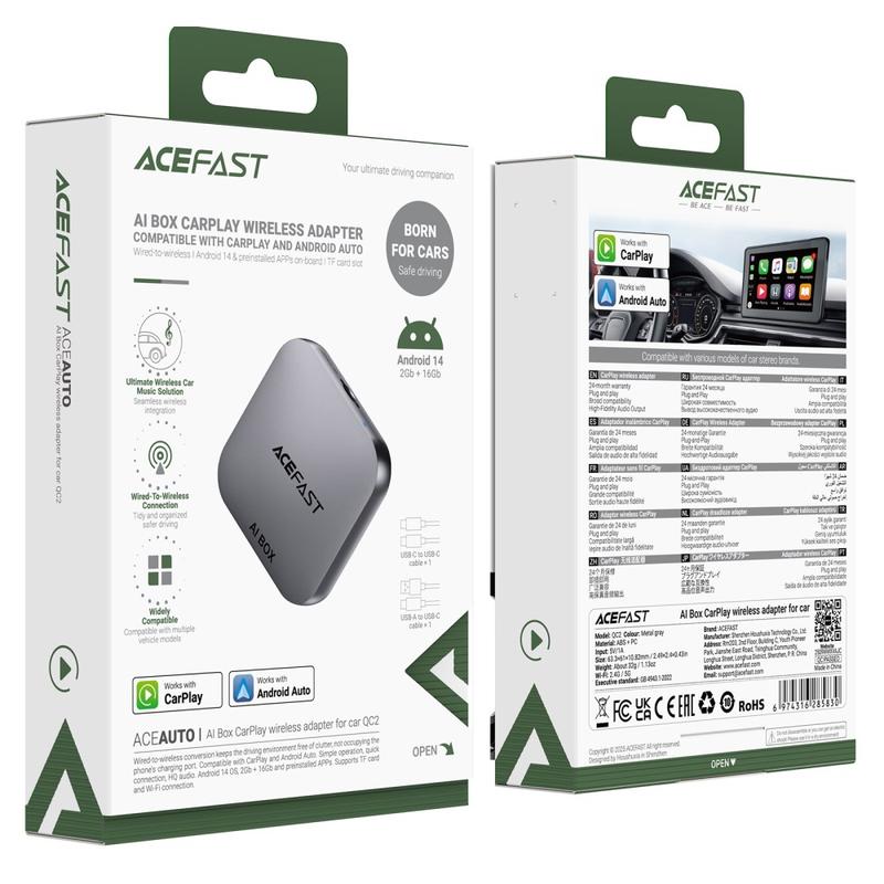 ACEFAST QC2 AI Box oferă vehiculului dvs. un upgrade modern instantaneu fără a înlocui unitatea principală. Conectivitatea sa wireless rapidă, capacitățile de divertisment, designul portabil și extinderea spațiului de stocare îl fac o soluție excelentă pentru șoferii care doresc comoditate, confort și flexibilitate. Fie că navigați, ascultați streaming sau preluați apeluri cu mâinile libere, acest adaptor compact îmbunătățește fiecare călătorie.