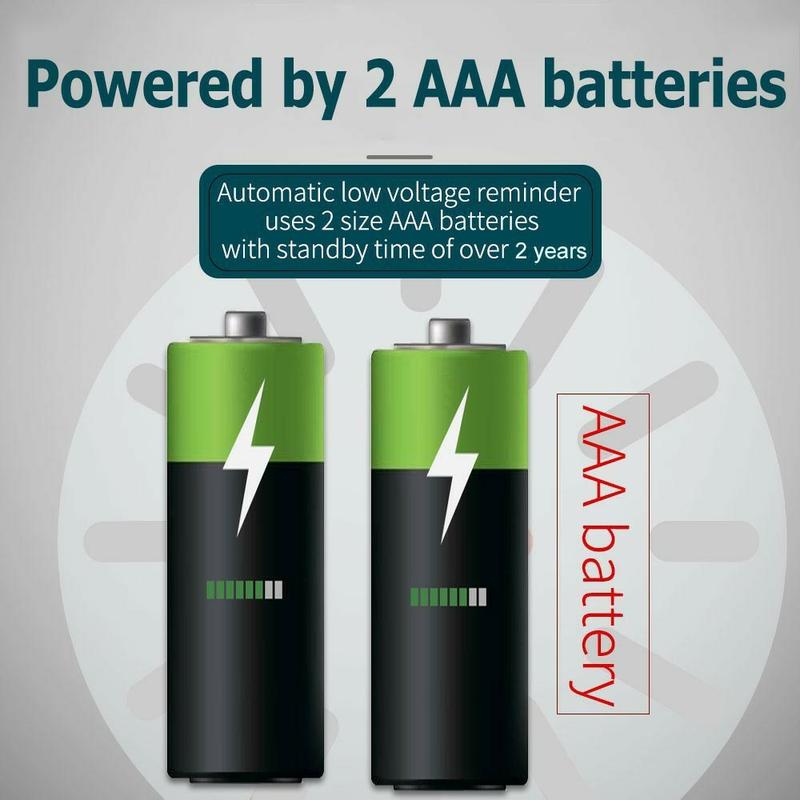 - Funcționează cu baterii: Funcționează cu 2 × baterii AAA (incluse) cu timp de așteptare lung și memento de baterie descărcată.