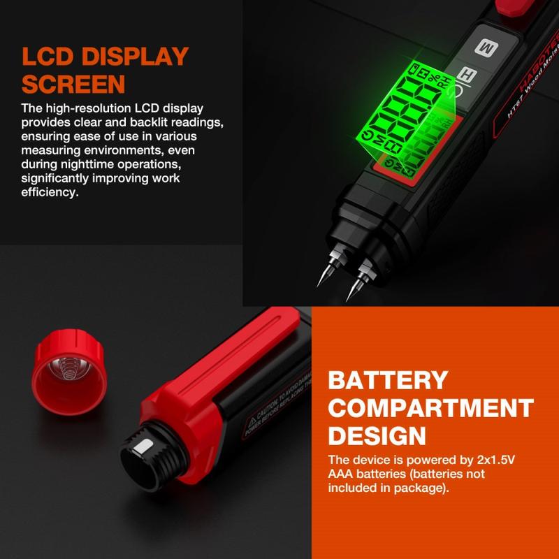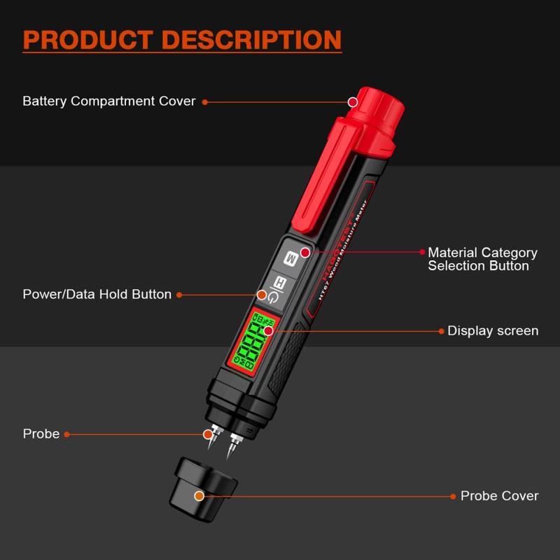 Carcasa în formă de stilou îl face ușor de transportat și de utilizat la fața locului, în timp ce sondele din oțel inoxidabil sunt concepute pentru testarea regulată pe diferite suprafețe. Un ecran LCD retroiluminat în 3 culori contribuie, de asemenea, la o citire mai ușoară a rezultatelor, afișând mai clar condițiile de umiditate dintr-o singură privire, chiar și în medii cu lumină slabă.