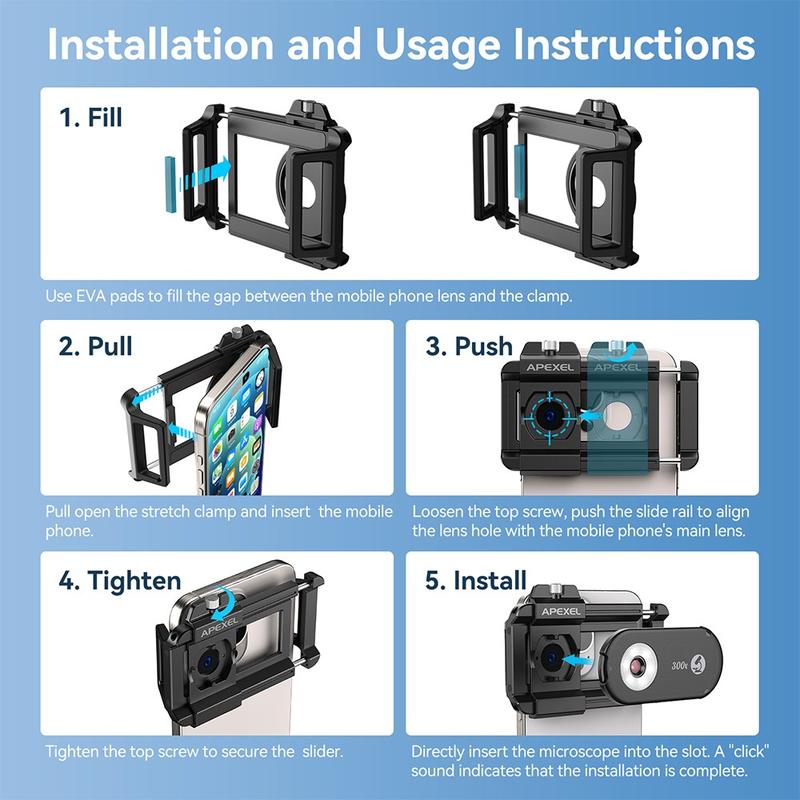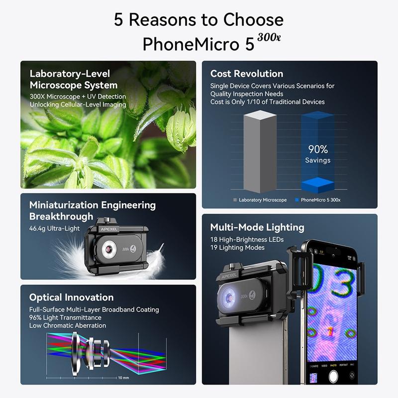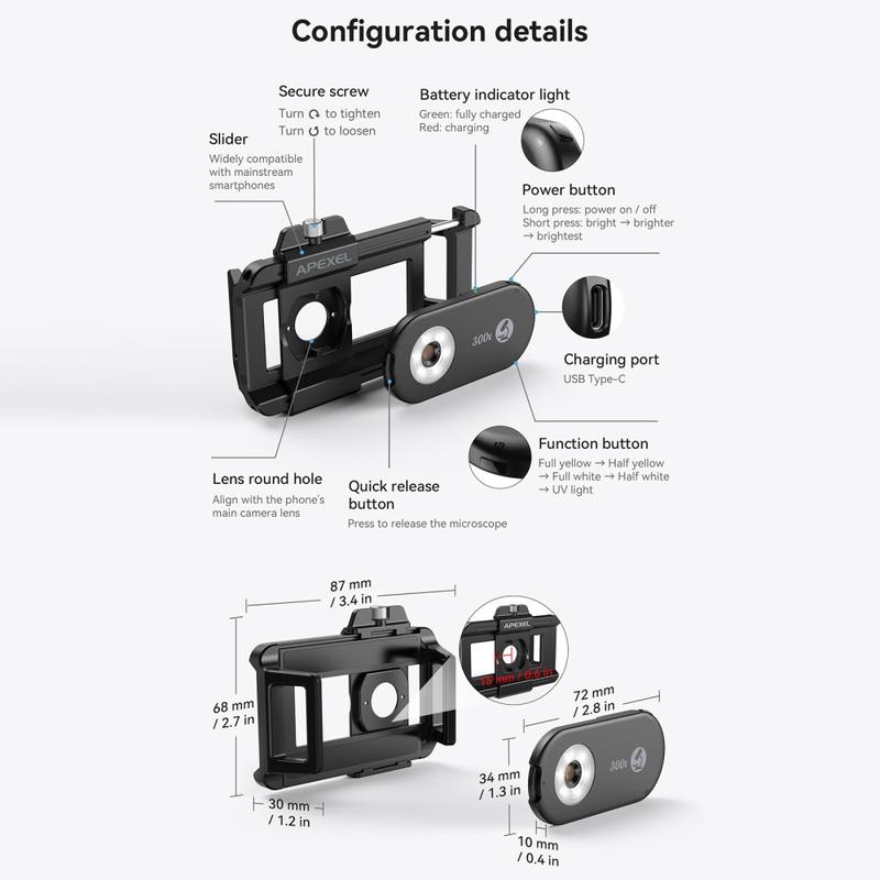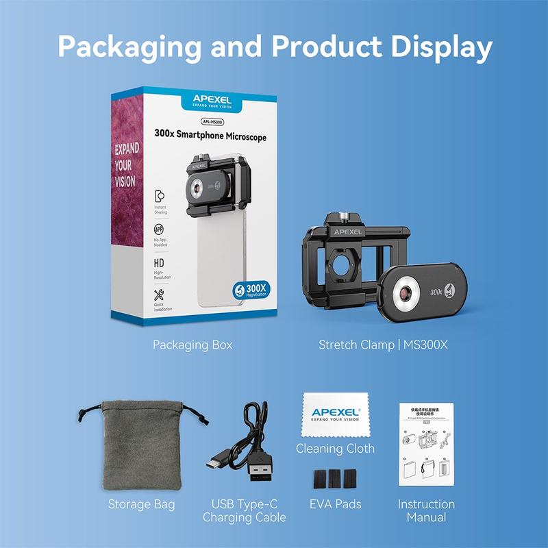 Transformați-vă smartphone-ul într-un microscop portabil puternic cu obiectivul de microscop APEXEL APL-MS300 300X cu clip. Proiectat cu optică de calitate profesională și sisteme avansate de iluminare, acest accesoriu compact aduce mărirea la nivel de laborator direct pe telefonul dvs. - perfect pentru pasionații de știință, educatori, bijutieri și tehnicieni.