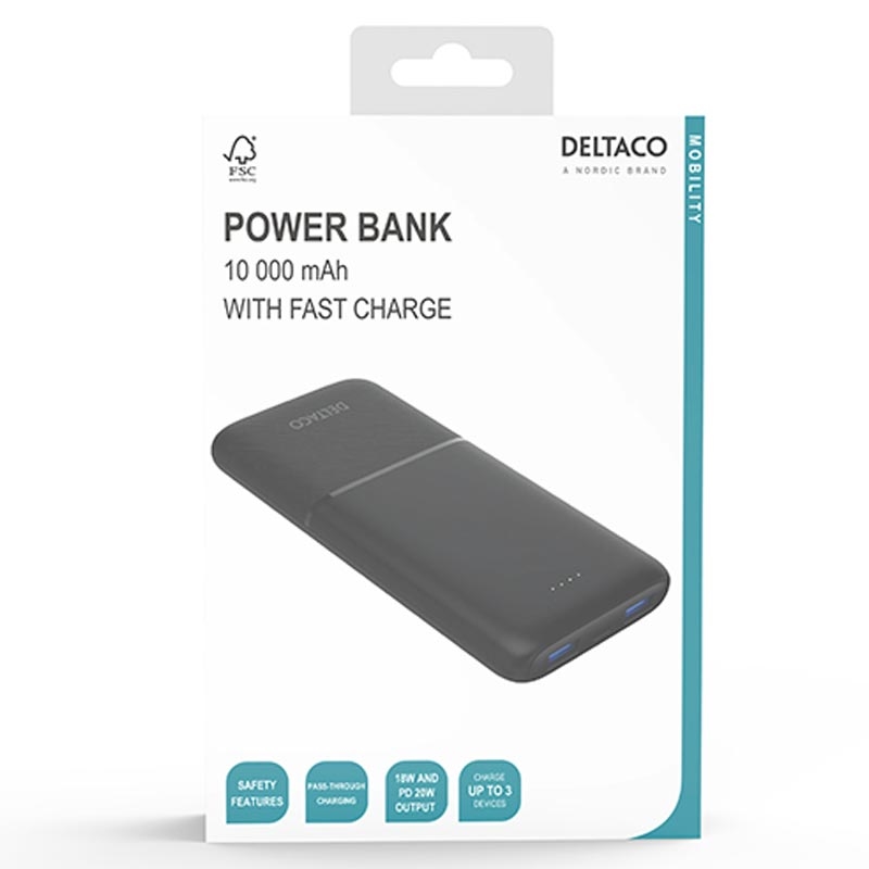 Baterie externă Deltaco de 10000mAh - încărcător portabil cu încărcare rapidă USB-C PD de 20 W și două porturi USB-A de 18 W