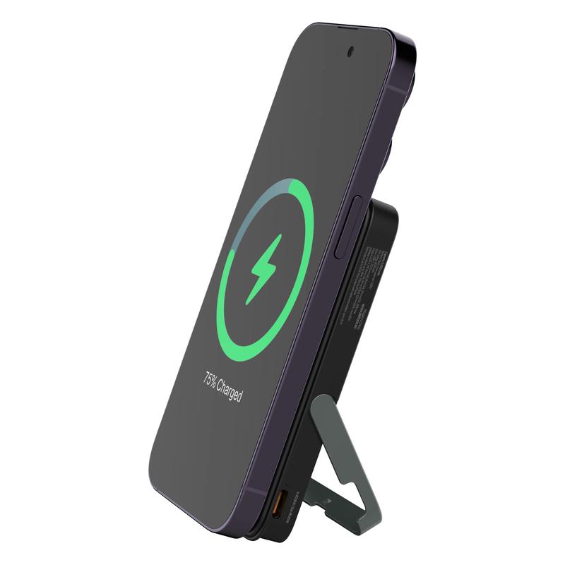 Cu o putere de încărcare wireless de până la 15 W pentru dispozitivele compatibile și de până la 7,5 W pentru iPhone-uri, aceasta facilitează încărcarea fără cabluri. Magnetul încorporat este compatibil cu soluția magnetică Apple și cu sisteme similare, ajutând la menținerea bateriei externe aliniate în timpul utilizării. Suportul integrat adaugă flexibilitate suplimentară, facilitând vizionarea videoclipurilor, navigarea pe internet sau participarea la apeluri în timp ce telefonul se încarcă.