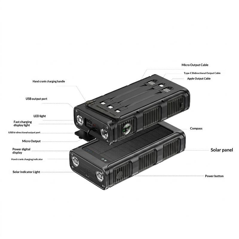 Rămâneți cu bateria încărcată în natură cu această baterie externă solară cu manivelă de 30000mAh, un încărcător portabil robust conceput pentru camping, drumeții, călătorii și situații de urgență. Cu 3 metode de încărcare - încărcare rapidă prin cablu, încărcare solară și alimentare de rezervă prin manivelă - vă oferă mai multă flexibilitate atunci când sursele tradiționale de energie nu sunt disponibile.