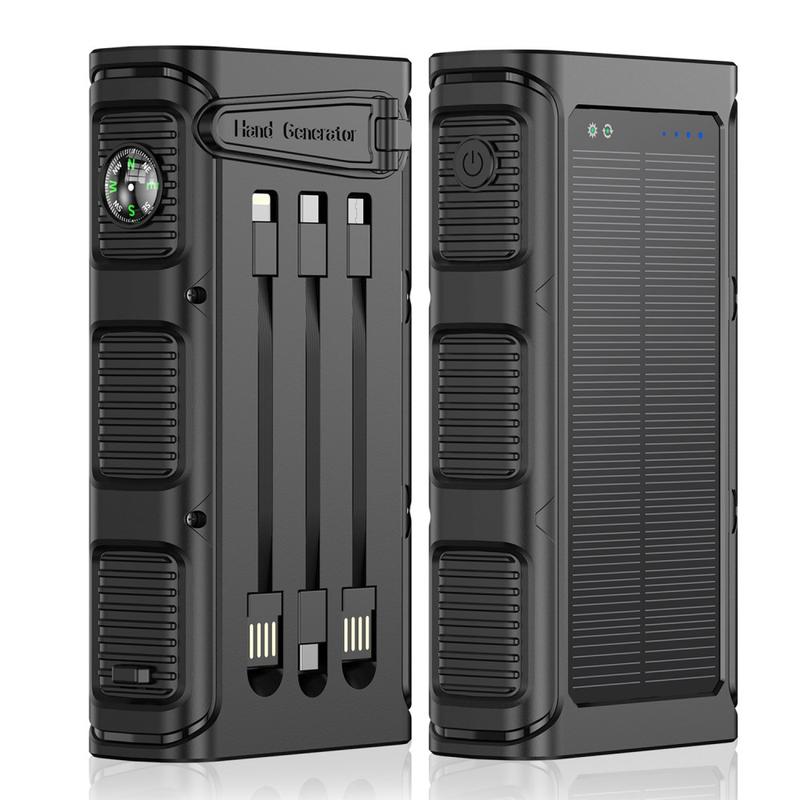 Baterie externă solară cu manivelă de 30000mAh - Încărcător portabil pentru exterior cu încărcare rapidă PD 20 W, dotat cu lanternă, alarmă SOS, busolă și cabluri integrate