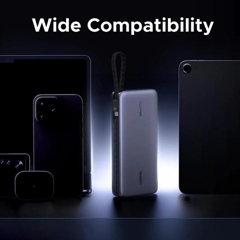 Ugreen PB552 este o baterie externă de înaltă performanță, concepută pentru utilizatorii intensivi care au nevoie de o sursă de alimentare puternică, departe de priză. Cu o capacitate de 25000mAh și o putere totală de până la 165W, poate încărca eficient laptopuri, tablete, smartphone-uri și accesorii în timpul călătoriilor, al muncii la distanță, al întâlnirilor și al zilelor lungi petrecute în deplasare. Două cabluri USB-C încorporate vă mențin configurația curată și gata de utilizare, iar capacitatea de a încărca până la patru dispozitive simultan o transformă într-un hub de încărcare all-in-one fiabil, pe care îl puteți transporta cu ușurință.