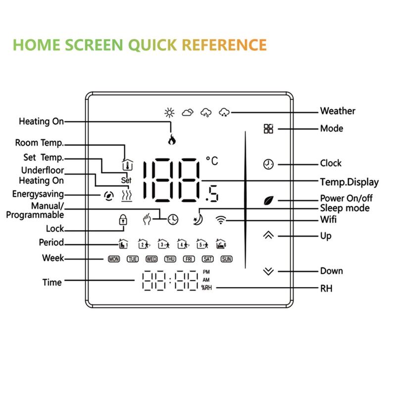 Acest termostat are o față elegantă, fără ramă, cu un ecran LCD de 3,0 inci și o margine curbată 2,5D pentru un aspect curat și modern. Butoanele tactile capacitive ascunse mențin aspectul minimalist, păstrând în același timp funcționarea simplă și intuitivă. Ecranul LED multicolor facilitează verificarea setărilor și monitorizarea condițiilor din cameră dintr-o singură privire.