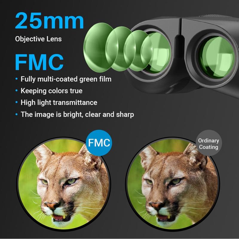APEXEL 10×25 oferă performanțe optice mari într-un cadru mic. Cu prisme BAK4, acoperiri FMC, un câmp vizual larg și un design pliabil de buzunar, acestea sunt perfecte pentru călătorii și iubitorii de activități în aer liber care doresc claritate fără a transporta echipamente voluminoase.