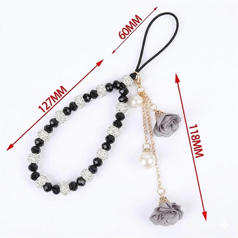 Cordon pentru telefon cu mărgele de cristal de 18,7 cm și pandantive în formă de trandafir - accesoriu pentru telefon mobil cu curea de mână