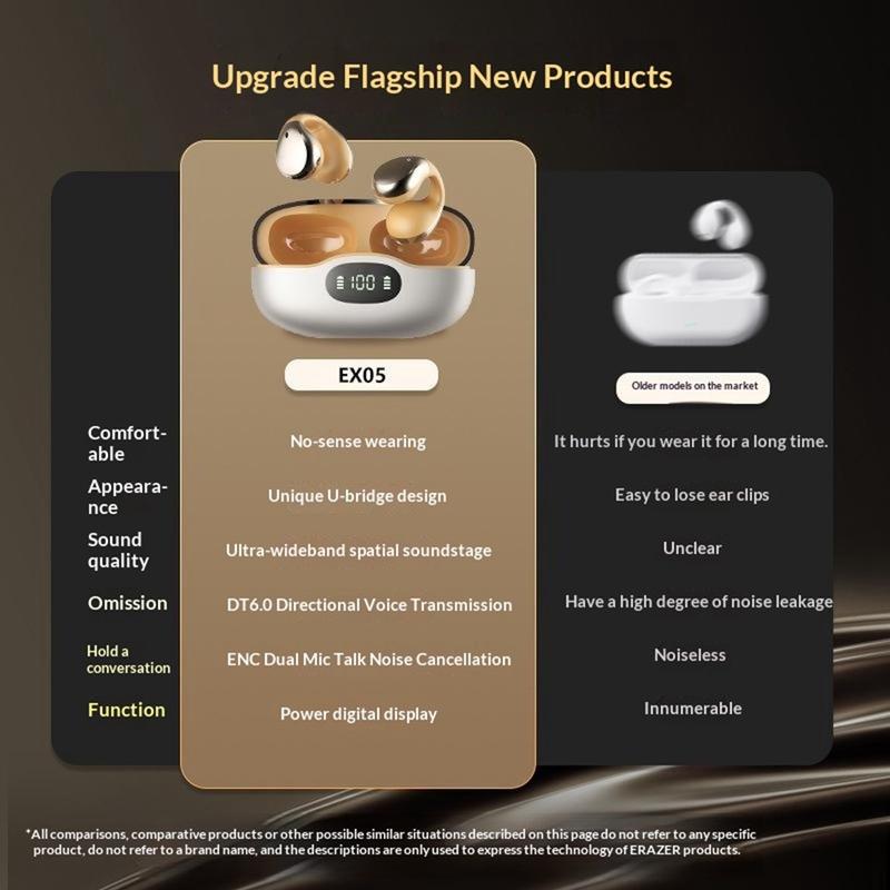 ERAZER EX05 este o alegere excelentă pentru utilizatorii care doresc o alternativă mai confortabilă la căștile intraauriculare tradiționale. Designul cu prindere pe ureche le face ușor de purtat pentru perioade mai lungi, în timp ce carcasa de încărcare și afișajul bateriei adaugă confort în viața de zi cu zi.