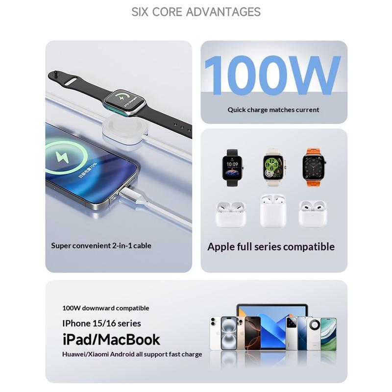 Acest cablu de încărcare rapidă 2 în 1 elimină dezordinea prin combinarea unui conector PD puternic de 100W cu un încărcător magnetic pentru Apple Watch. Magnetul puternic asigură o aliniere perfectă, fără griji, în timp ce miezul de cupru sporește eficiența și protejează bateriile dispozitivelor în timpul încărcării rapide. Compatibilitatea sa largă cu protocolul îl face ideal pentru utilizatorii cu mai multe dispozitive - oferind viteză, confort și fiabilitate pe termen lung într-un singur accesoriu compact.