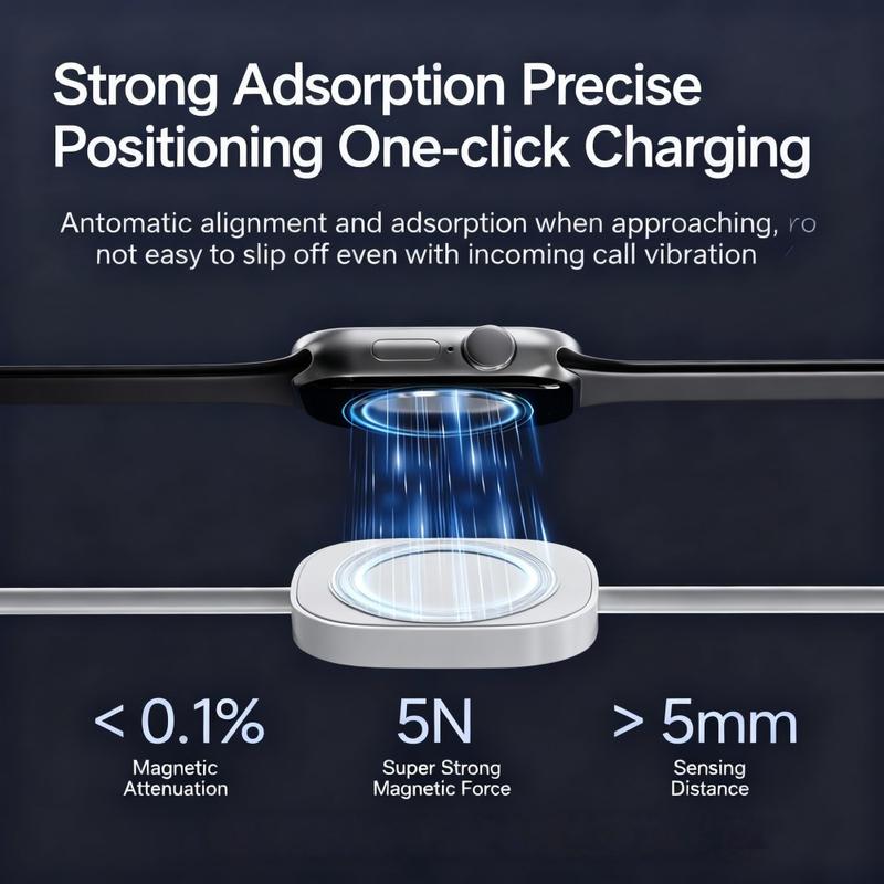 - Încărcătoarele magnetice pentru Apple Watch utilizează o aliniere precisă pentru a reduce pierderea de energie și a preveni supraîncălzirea.