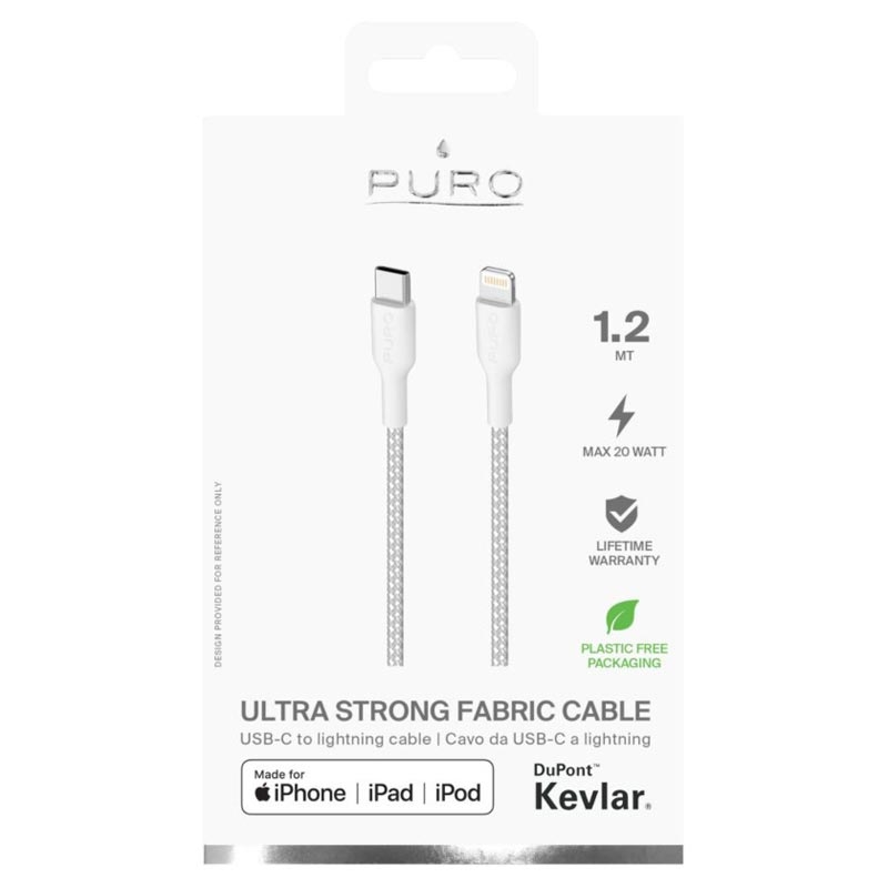 Cablu de încărcare și sincronizare Puro cu lungimea de 1,2 metri, de la USB-C la Lightning și fabricat din materiale ultrarezistente, cum ar fi țesătura Kevlar.