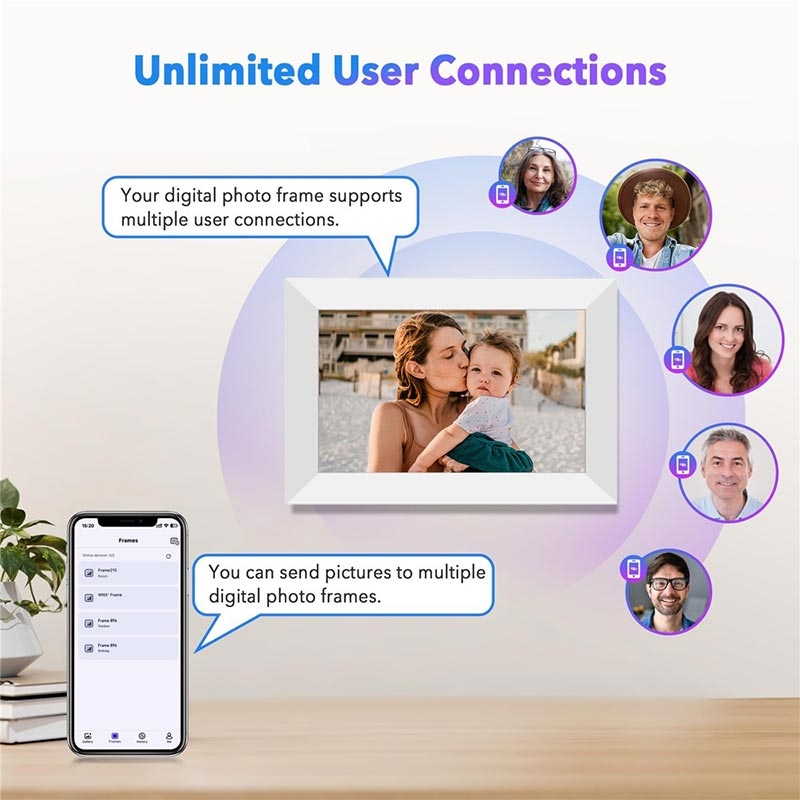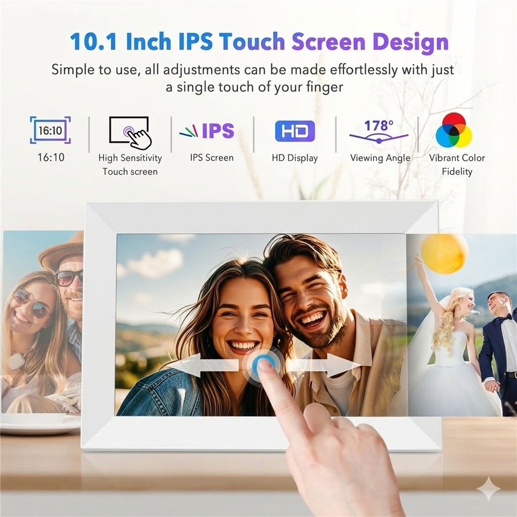 Această ramă foto digitală WiFi de 10.1" oferă o calitate clară a afișajului, partajare wireless inteligentă, stocare generoasă și conectivitate multi-utilizator, fiind soluția modernă perfectă pentru familii, birouri sau ca un cadou grijuliu.