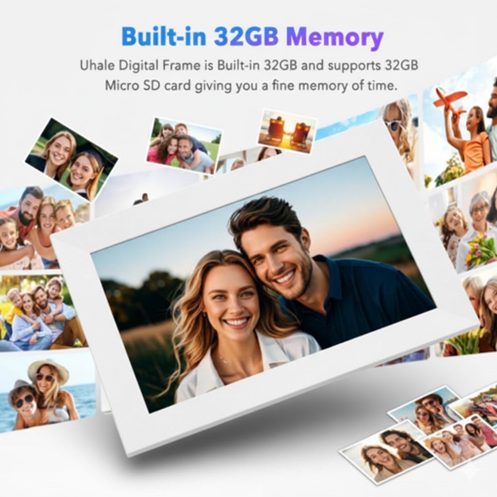 Rama include 32 GB de stocare internă, suficient pentru mii de fotografii. Aveți nevoie de mai mult spațiu? Introduceți un card Micro SD pentru stocare suplimentară și gestionare ușoară a fișierelor.