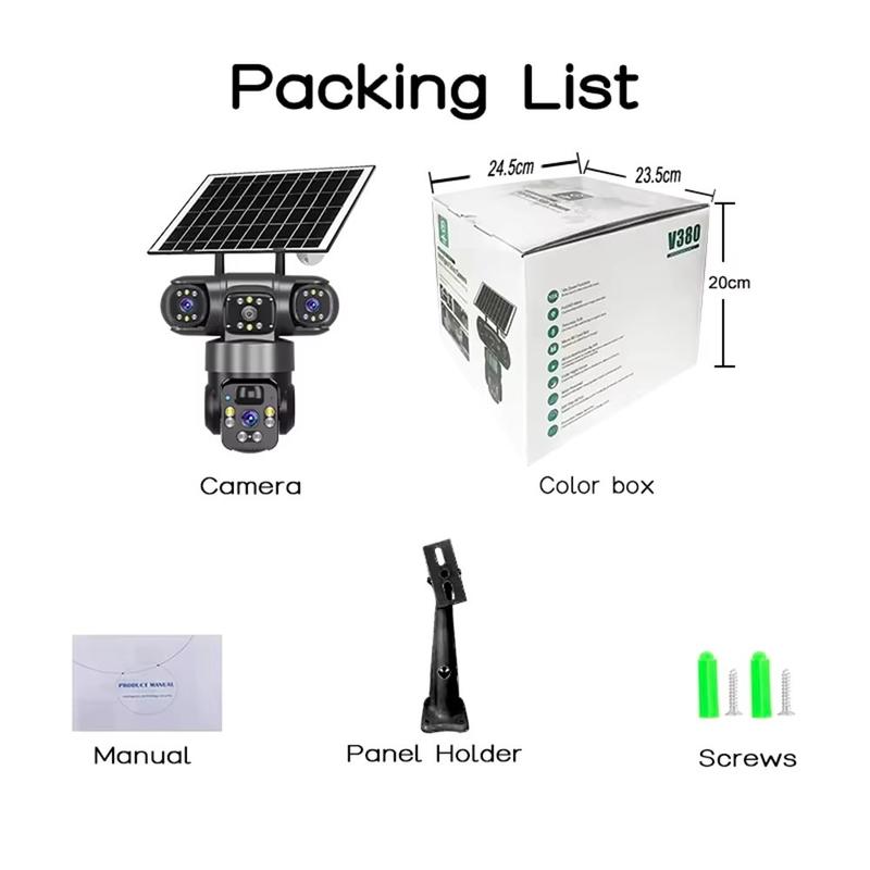 Cameră de securitate WiFi PTZ pentru exterior V380 Pro Solar cu 3 obiective 2K - Urmărire umană, audio bidirecțional, IP67, H.265, stocare TF/Cloud