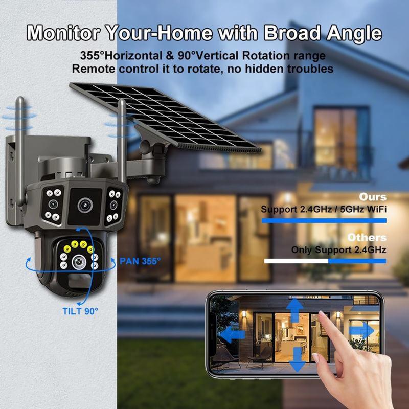 Securizați zonele exterioare cu acoperire largă și mai puține unghiuri moarte folosind camera de securitate solară cu lentilă dublă QL18. Concepută pentru configurare wireless ușoară pe WiFi de 2,4 GHz, aceasta combină două lentile cu control PTZ, astfel încât să puteți monitoriza zonele cheie și să reglați de la distanță vizualizarea atunci când este detectată activitate. Rezoluția 2K (2560x1440) oferă detalii mai clare pentru intrări, curți, livezi și șantiere, în timp ce compresia H.265 ajută la economisirea spațiului de stocare fără a sacrifica claritatea.