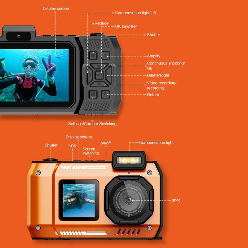 Camera de acțiune impermeabilă D50 este concepută pentru aventuri în aer liber, călătorii și sporturi nautice, combinând un design cu ecran dublu cu o operare ușoară și o durată lungă de funcționare. Utilizați ecranul IPS frontal de 1,44" pentru selfie-uri și vlogging, iar ecranul IPS HD posterior de 2,88" pentru încadrare, redare și revizuire rapidă. Cu impermeabilitate IP68 până la 10 m, este pregătită pentru zile la piscină, snorkelling și drumeții pe timp ploios. Cei creativi vor aprecia cele 20 de efecte speciale de filtrare, în timp ce sistemul electronic anti-vibrații ajută la menținerea fluidității imaginilor atunci când vă mișcați. Funcția SOS integrată, activabilă cu un singur clic, oferă un plus de siguranță pentru activitățile în aer liber. Acest set include și un card TF de 32GB și un cititor de carduri, astfel încât să puteți începe filmarea imediat.
