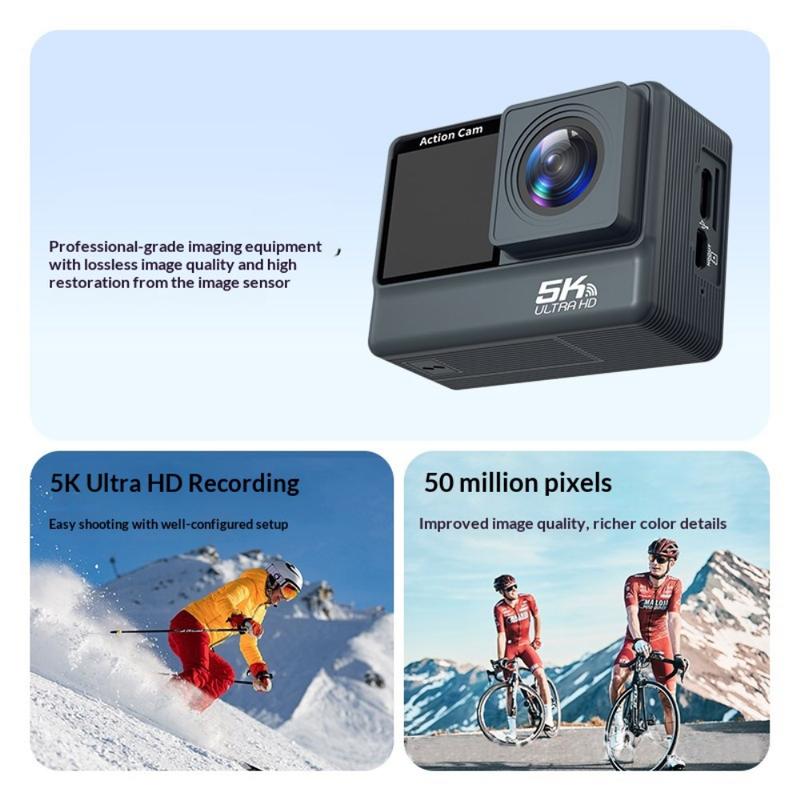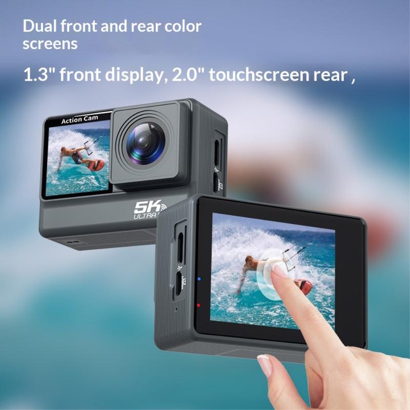 Cameră de acțiune cu ecran dublu F308AATR - Cameră sportivă 5K HD cu stabilizare pe 6 axe, WiFi și carcasă impermeabilă