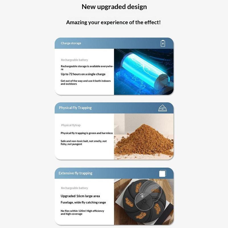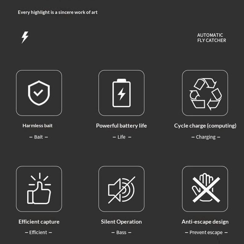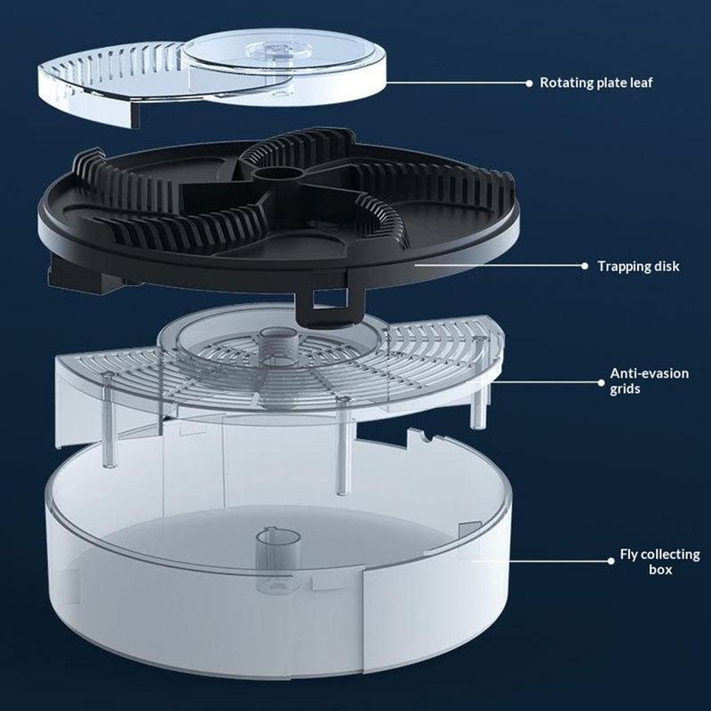 Mecanismul rotativ automat funcționează cu un zgomot redus, făcându-l potrivit pentru utilizare atât ziua, cât și noaptea, fără a provoca deranj. Suprafața largă de capturare de 16 cm și aria de acoperire de până la 120 m îl fac eficient pentru spații interioare mai mari, în timp ce designul anti-evadare ajută la menținerea insectelor capturate în interior. Structura detașabilă facilitează, de asemenea, întreținerea, permițând curățarea regulată pentru o utilizare pe termen lung mai igienică.