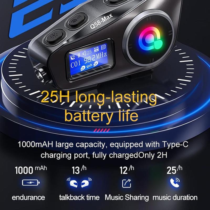 Conceput pentru utilizare regulată în aer liber, setul de căști are un grad de impermeabilitate IPX6 și un sistem de instalare detașabil cu două cleme, conceput pentru a se potrivi unei game largi de stiluri de căști, inclusiv căști integrale, off-road, semi-integrale și vintage. Bateria de 1000 mAh oferă până la 25 de ore de redare muzicală sau convorbiri, până la 15 ore de utilizare a interfonului și până la 300 de ore de autonomie în standby. Cu încărcare de tip C, suport pentru card TF și un microfon rigid inclus, Q58Max este o alegere practică pentru motocicliștii care doresc un sistem de comunicare pentru cască bogat în funcții.