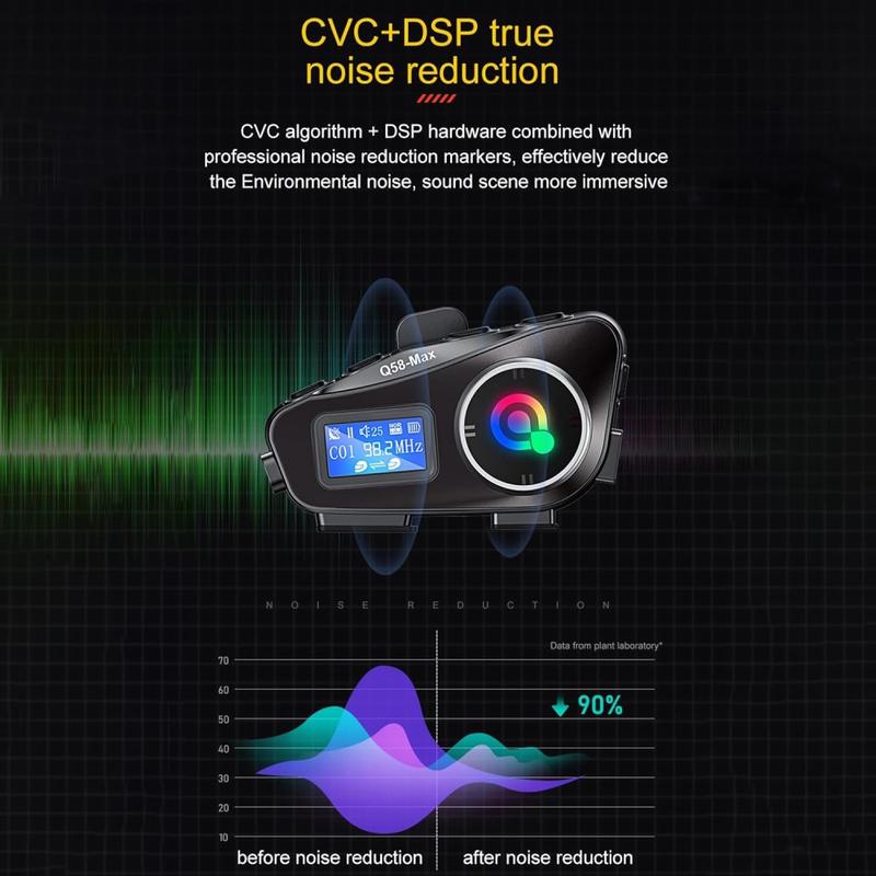 Q58Max utilizează cipuri Bluetooth 5.3 dual-core și suportă comunicarea prin intercom între doi motocicliști la distanțe de până la 500m în condițiile specificate. De asemenea, suportă gestionarea apelurilor prioritare în timpul utilizării intercomului, ajutând apelurile primite să aibă prioritate atunci când este necesar. Cu difuzoare de 40 mm și 6 efecte de sunet EQ, căștile sunt proiectate pentru a oferi un sunet mai clar pentru apeluri, indicații de navigare, muzică și comunicare prin intercom în medii tipice de conducere.