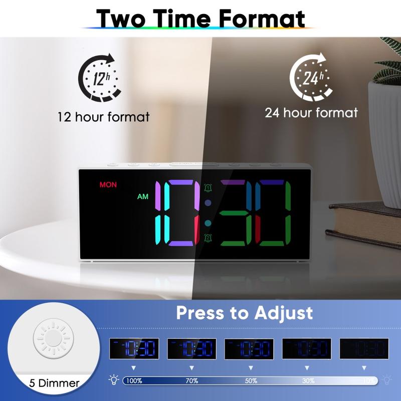Ceasul cu alarmă digitală GS-G11 RGB este un ceas de masă modern, conceput pentru dormitoare, sufragerii și birouri, unde vizibilitatea clară și controlul ușor sunt importante. Afișajul său LED vibrant oferă multiple moduri de culoare RGB, în timp ce luminozitatea și volumul reglabile vă permit să adaptați ceasul la camera și rutina dvs. Cu două alarme, o funcție convenabilă de amânare a alarmei și memorie de rezervă pentru întreruperi de curent, este un ceas practic pentru fiecare zi, care adaugă și un plus de stil spațiului dvs.