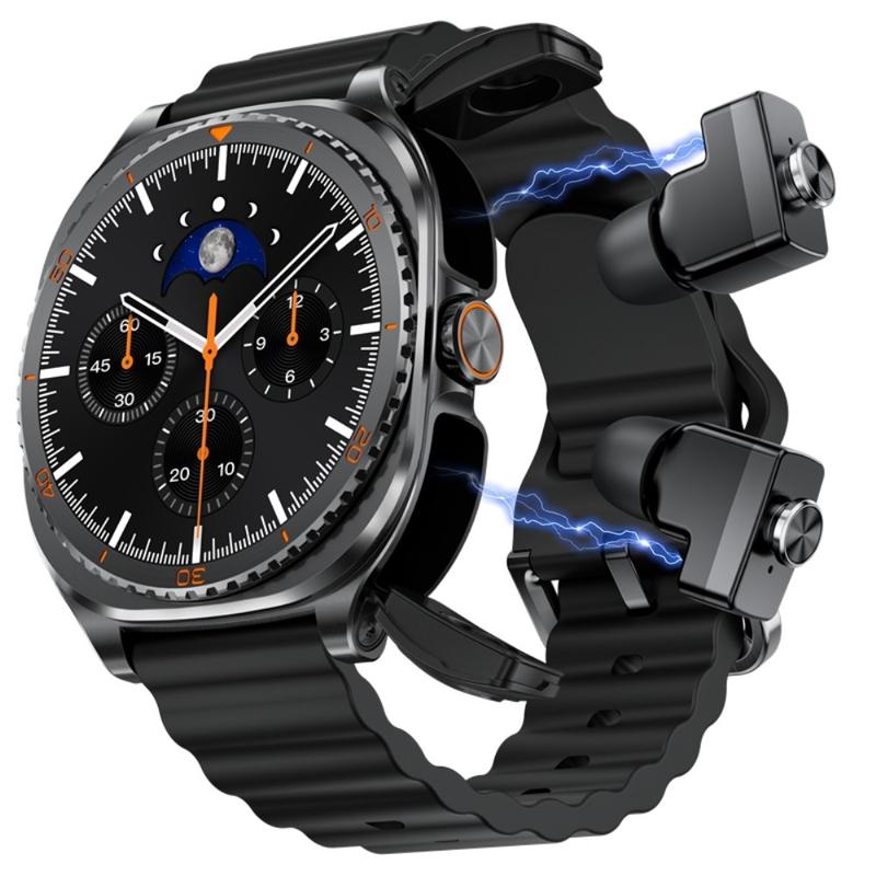Bucurați-vă de confortul unui ceas inteligent și al căștilor wireless într-un singur dispozitiv inteligent de uz zilnic cu GT99. Acest design 2-în-1 combină un ceas inteligent full-touch pentru fitness cu căști magnetice TWS încorporate, astfel încât să puteți urmări activitatea, verifica notificările și asculta muzică fără a purta accesorii suplimentare. Căștile se fixează perfect în corpul ceasului pentru depozitare și încărcare, făcând GT99 o alegere practică pentru naveta, antrenamente și utilizare zilnică.