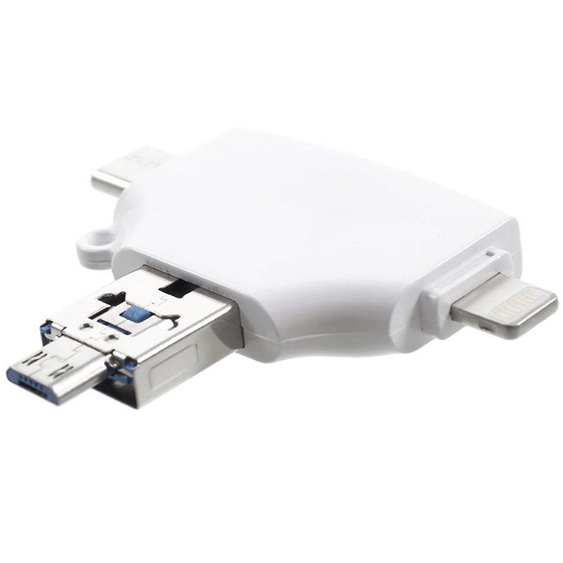 Acest dispozitiv unic vă permite să transferați în mod convenabil toate imaginile, videoclipurile și alte date esențiale între smartphone, tabletă, laptop, PC și MacBook. Acest cititor de carduri multifuncțional este compatibil cu majoritatea cardurilor de memorie microSD / SD și are 4 conectori de ieșire diferiți: Type-C, Lightning, microUSB și port USB-A 2.0. Utilizați fiecare dintre porturile pentru dispozitivul dvs. dedicat și bucurați-vă de un transfer convenabil de date. Acest cititor de carduri este foarte mic și portabil, așa că îl puteți avea întotdeauna lângă dvs. oriunde ați merge.