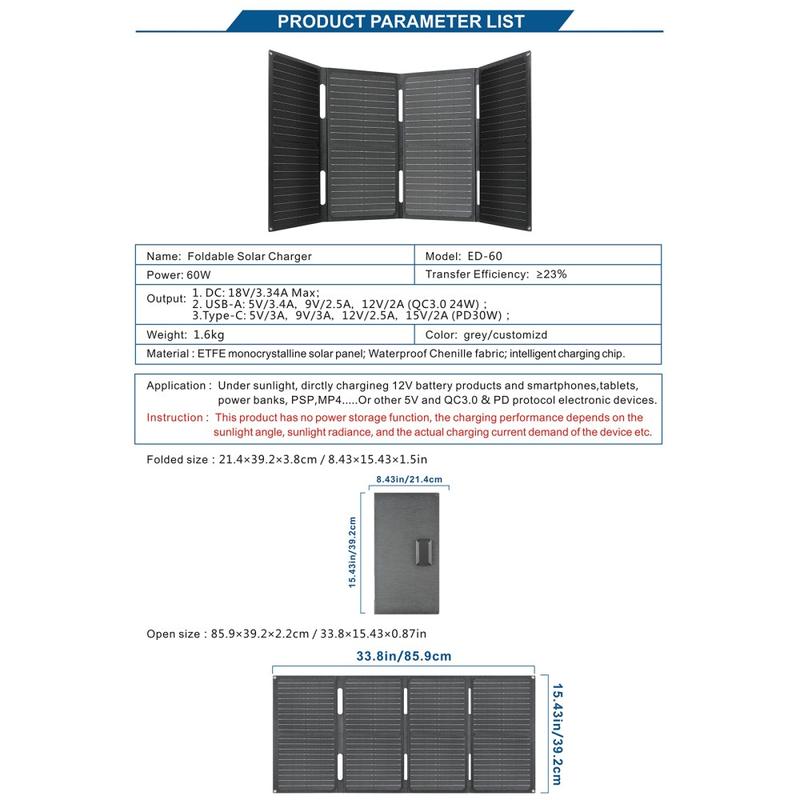 DE-60 Panou solar pliabil de 60W și încărcător - Încărcător solar portabil monocristalin cu ieșiri USB-C, USB-A și DC