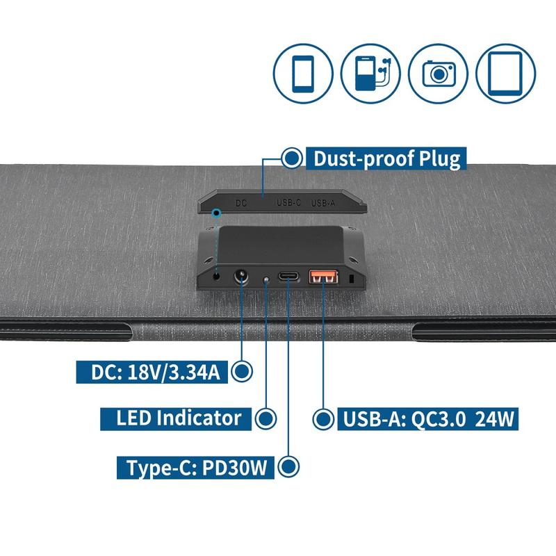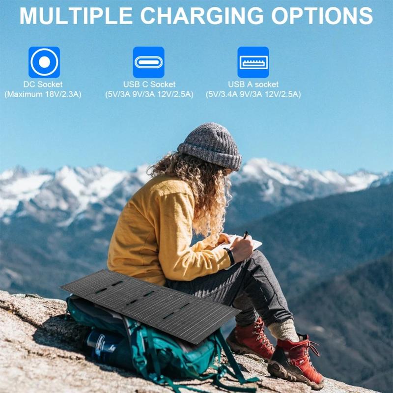 Datorită designului compact și pliabil, acest încărcător solar este ușor de transportat într-un rucsac, de depozitat într-un vehicul sau de atașat la echipamentul de exterior în timpul călătoriilor. În ciuda dimensiunilor sale portabile, acesta oferă o putere de ieșire de până la 60W și multiple opțiuni de încărcare, inclusiv DC, USB-A și USB-C, fiind astfel potrivit pentru încărcarea telefoanelor, tabletelor, bateriilor externe, laptopurilor mai mici, camerelor foto și a altor dispozitive compatibile.