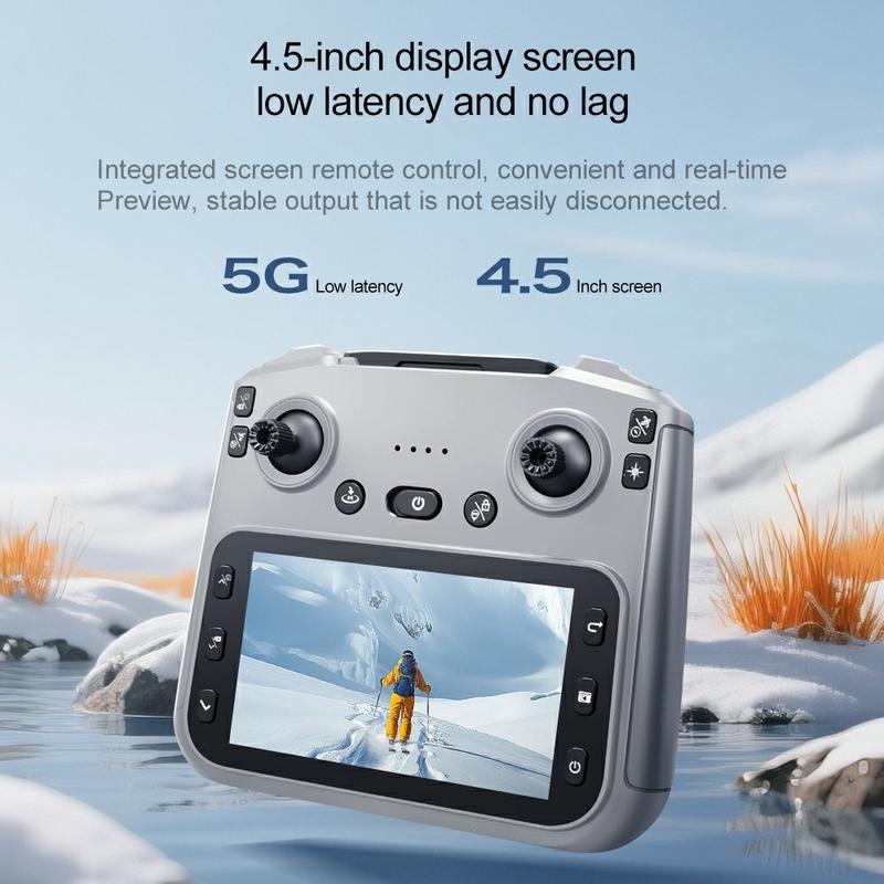 - Transmisia FPV 5G WiFi oferă vizualizarea imaginilor în timp real direct pe ecranul integrat de 4,5 inci al telecomenzii.