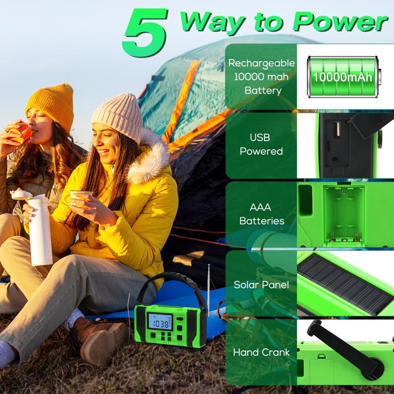 Nu veți rămâne niciodată fără energie datorită celor patru metode versatile de încărcare: Panou solar (0,1 W), Generator cu manivelă, Intrare Type-C, Baterie AAA de rezervă (bateriile AAA nu sunt incluse). Acest lucru asigură că radioul rămâne alimentat în timpul situațiilor de urgență, excursiilor cu cortul, furtunilor și aventurilor la distanță.