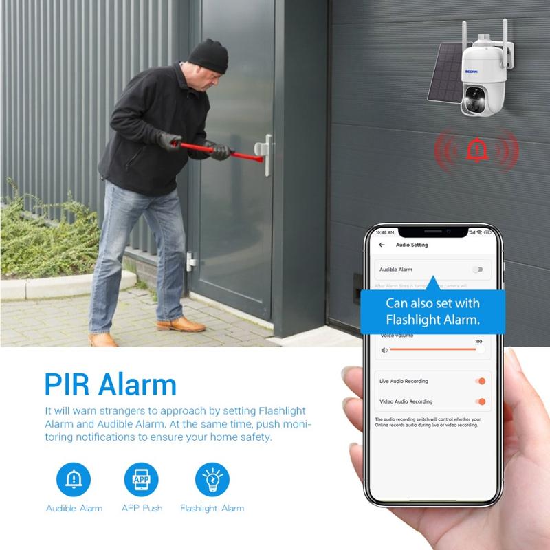 Suportă alarmă PIR, mesaj APP de împingere a mesajului, lumină albă intermitentă și avertizare sonoră de alarmă.