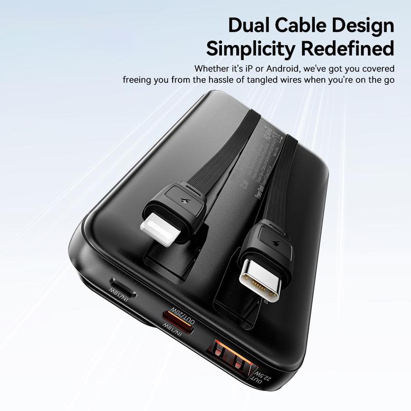 Echipată cu cabluri Type-C și Lightning integrate, această power bank elimină necesitatea de a transporta cabluri separate - ideal pentru utilizatorii cu mai multe dispozitive.