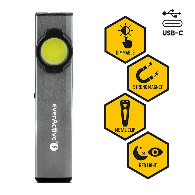 EverActive WL-250R Lanternă de atelier cu LED reîncărcabilă - 300 lumeni, 4 moduri, bază magnetică și clemă