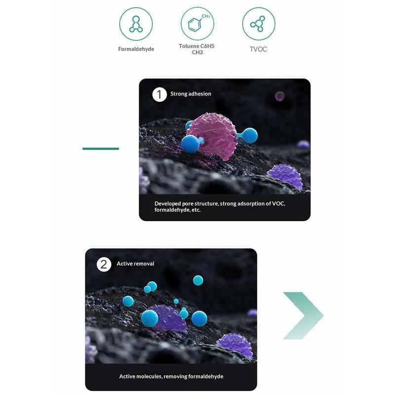 - Cărbunele activ catalitic ajută la absorbția formaldehidei, toluenului și compușilor TVOC