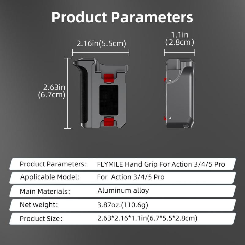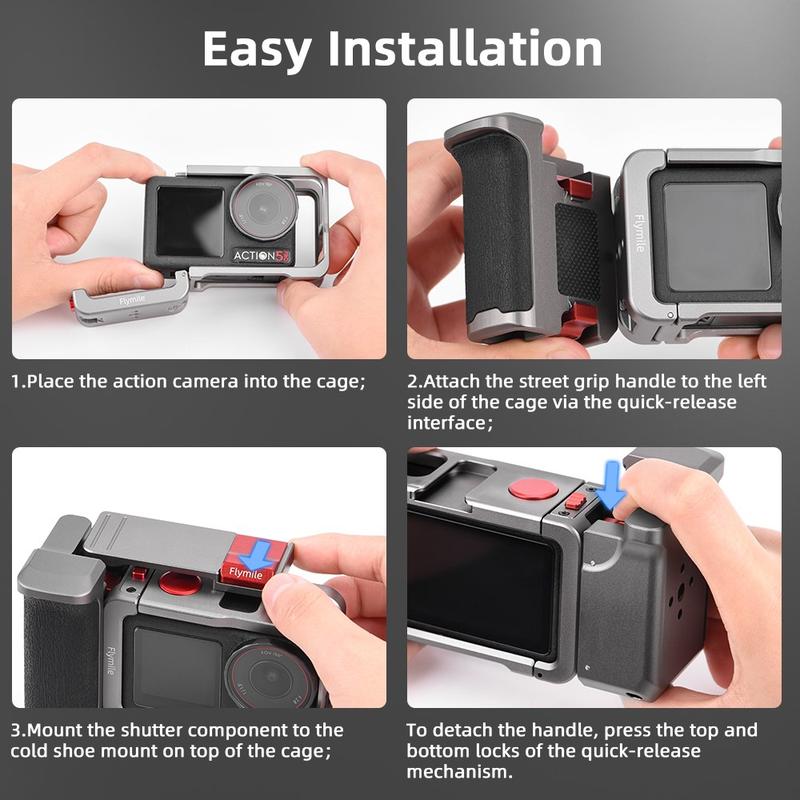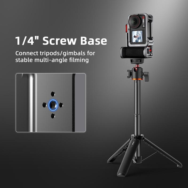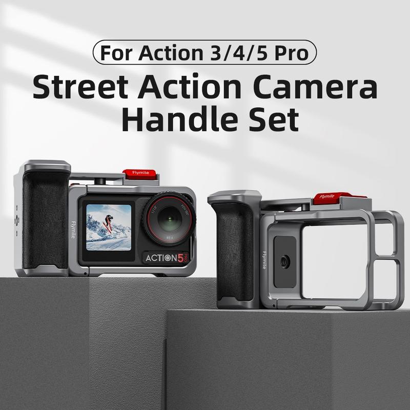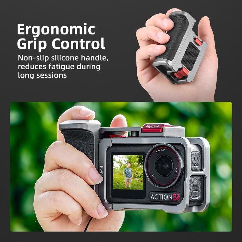 Setul de mâner și carcasă Flymile oferă protecție, confort și posibilitatea de a adăuga accesorii într-o configurație compactă, perfectă pentru creatorii care doresc un echipament DJI Osmo Action mai stabil și mai versatil pentru filmări în aer liber și cu aparatul în mână.