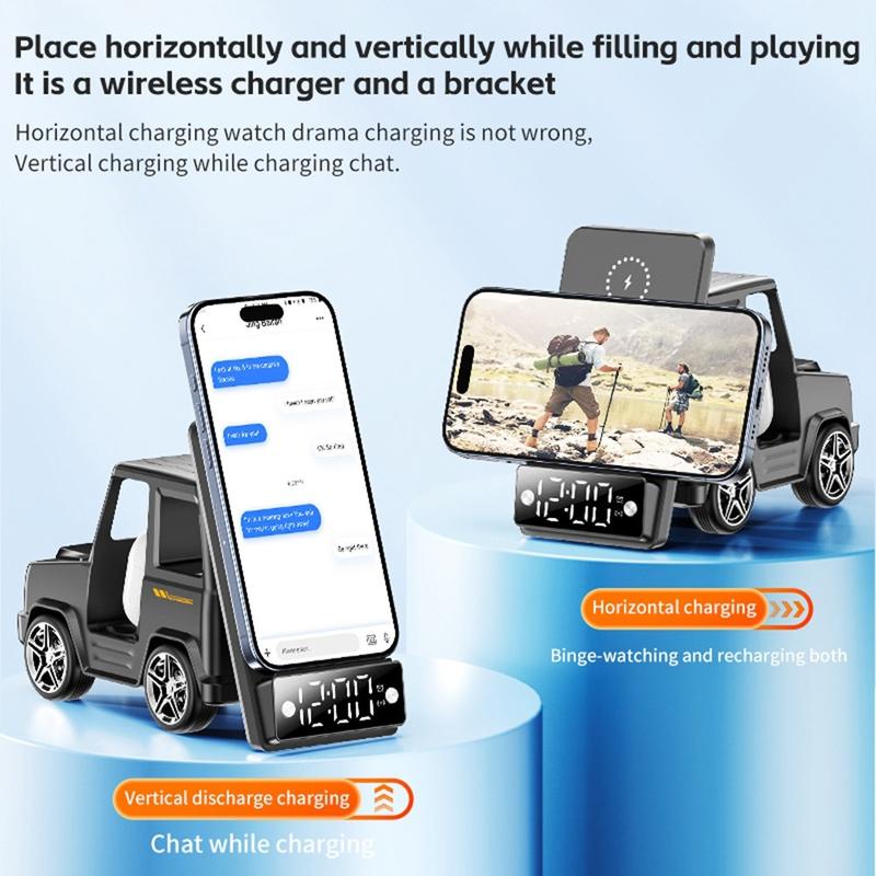 Revoluționați spațiul dvs. de lucru cu încărcătorul wireless în formă de mașină G63. Dispunând de încărcare wireless rapidă de 15W, acest dispozitiv multifuncțional alimentează simultan smartphone-ul, ceasul inteligent și căștile. Difuzorul Bluetooth încorporat oferă sunet de înaltă calitate, în timp ce ceasul integrat cu funcție de alarmă vă ajută să vă respectați programul. Cu designul său unic de mașină și iluminarea ambientală, acesta adaugă o notă modernă biroului sau noptierei dvs.