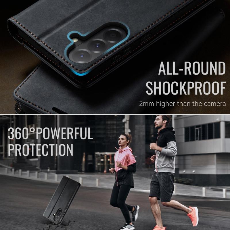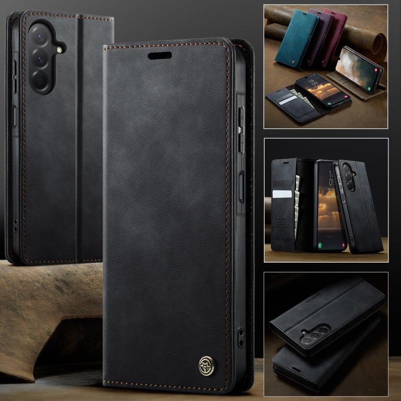 Carcasa de portofel CASEME seria 033 pentru Samsung Galaxy A57 este fabricată din poliuretan cu textură de vițel combinat cu TPU, oferind protecție completă împotriva zgârieturilor, impactului și uzurii zilnice, menținând în același timp un aspect premium și elegant.