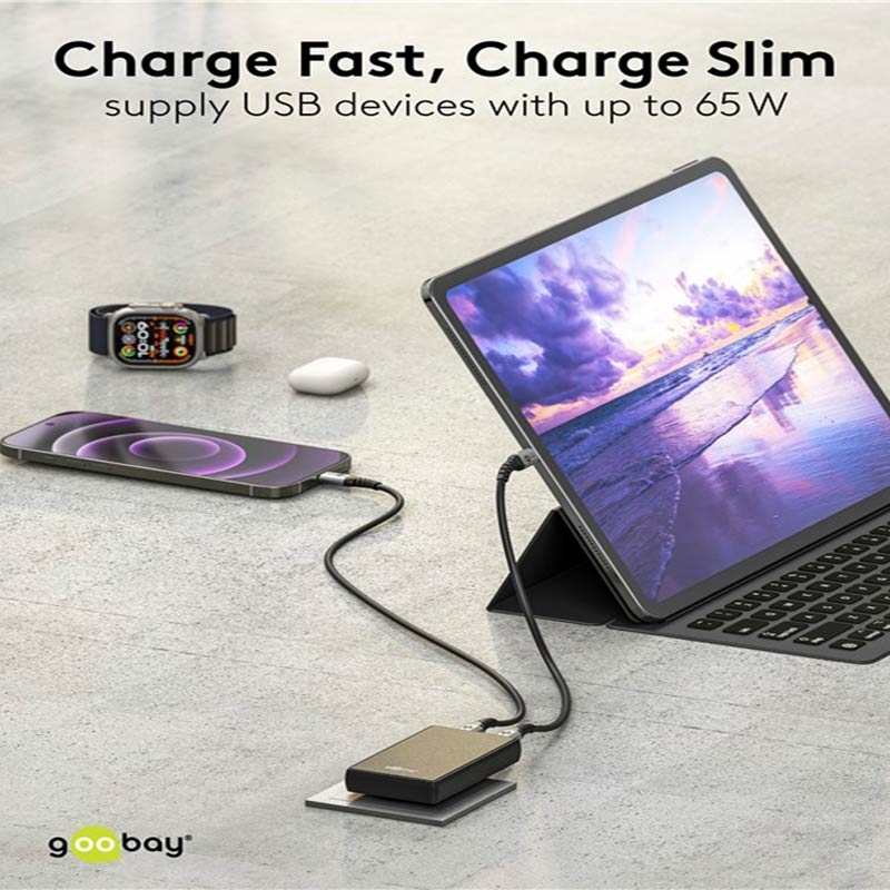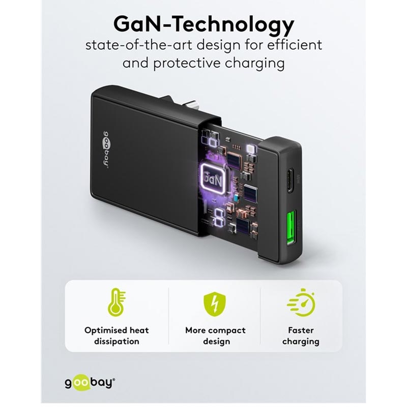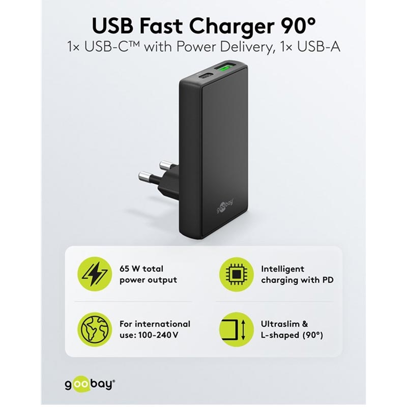Goobay GaN Încărcător rapid dual 90° plat 65W - încărcător de perete ultra-slim cu porturi USB-C și USB-A
