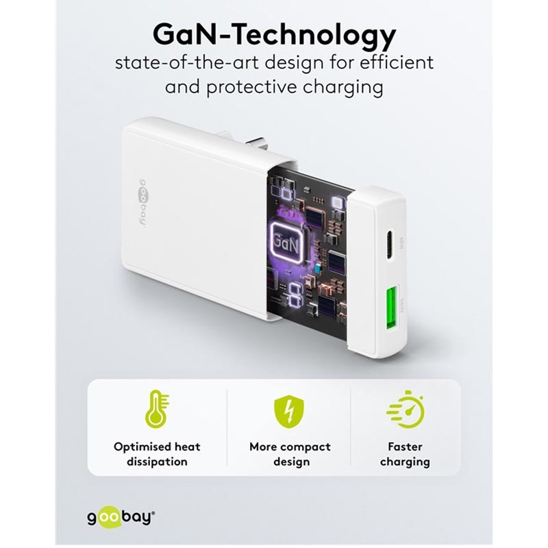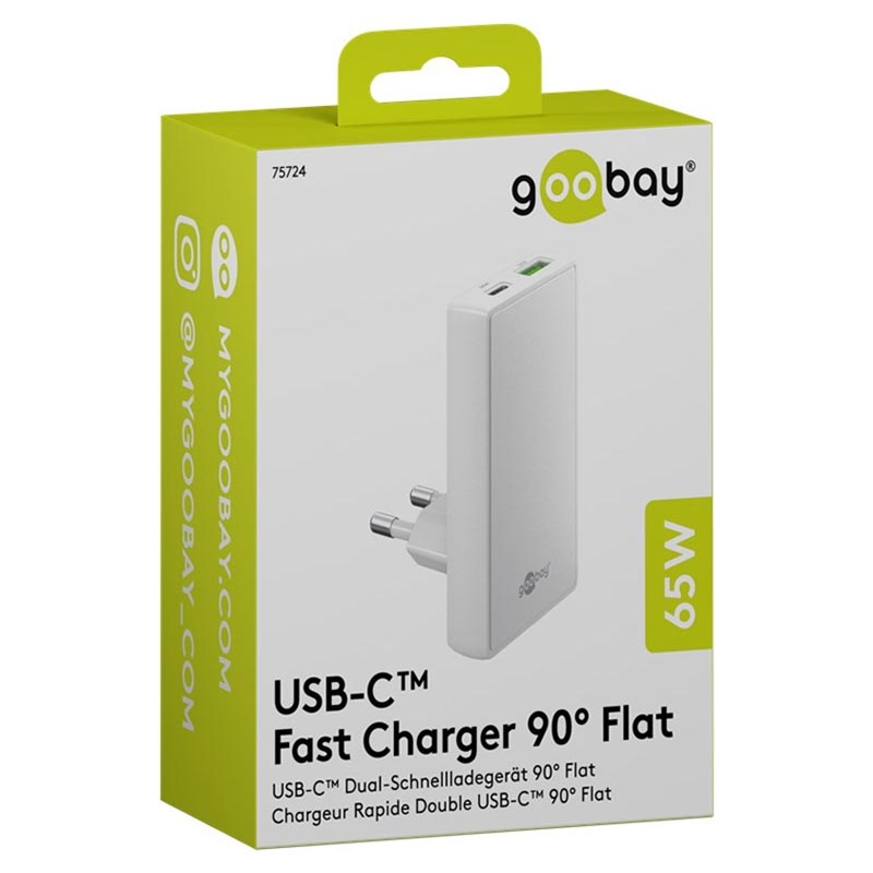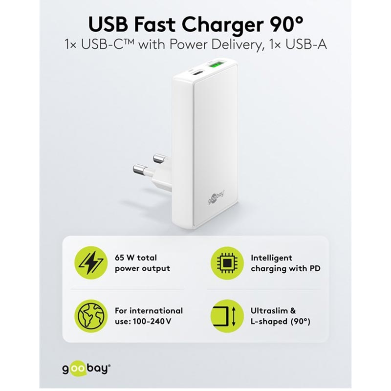 Goobay GaN Încărcător rapid dual 90° plat 65W - încărcător de perete ultra-slim cu porturi USB-C și USB-A