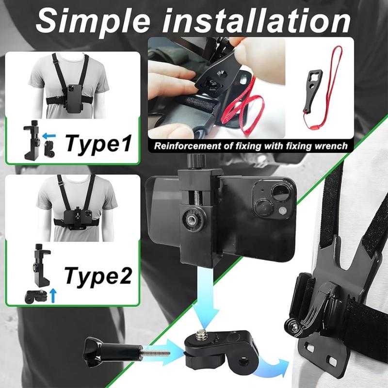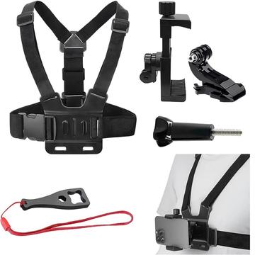 Acest ham pentru piept vă permite să atașați în siguranță o cameră de acțiune sau un smartphone în partea din față a pieptului, oferindu-vă un unghi POV captivant pentru a captura peisaje, sporturi și aventuri în aer liber.