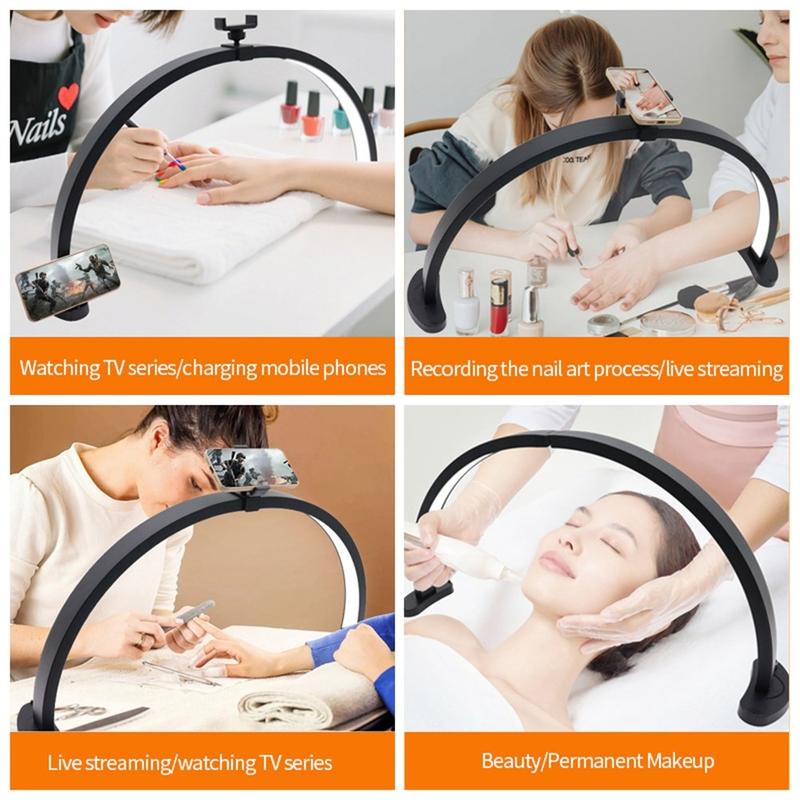 Creați o lumină curată și măgulitoare pentru munca de precizie cu lumina de umplere LED fără umbre în formă de U HD-M11X de 28 inch. Designul său semi-circular ajută la reducerea umbrelor dure, făcându-l ideal pentru tratamente de înfrumusețare, arta unghiilor, tatuaje, crearea de conținut și sarcini de birou detaliate. Cu 280 de LED-uri cu două culori, puteți comuta între tonuri calde și reci și puteți regla fin atmosfera de la 3200K la 5600K. Un CRI ridicat >90 ajută culorile să pară naturale și precise - deosebit de util atunci când potriviți tonurile machiajului, alegeți culorile unghiilor sau lucrați cu tonurile pielii. Lampa oferă o luminozitate de până la 2500 lm la 40 W și include suporturi de birou plus un set de accesorii pentru suportul telefonului pentru o configurație ordonată a stației de lucru.