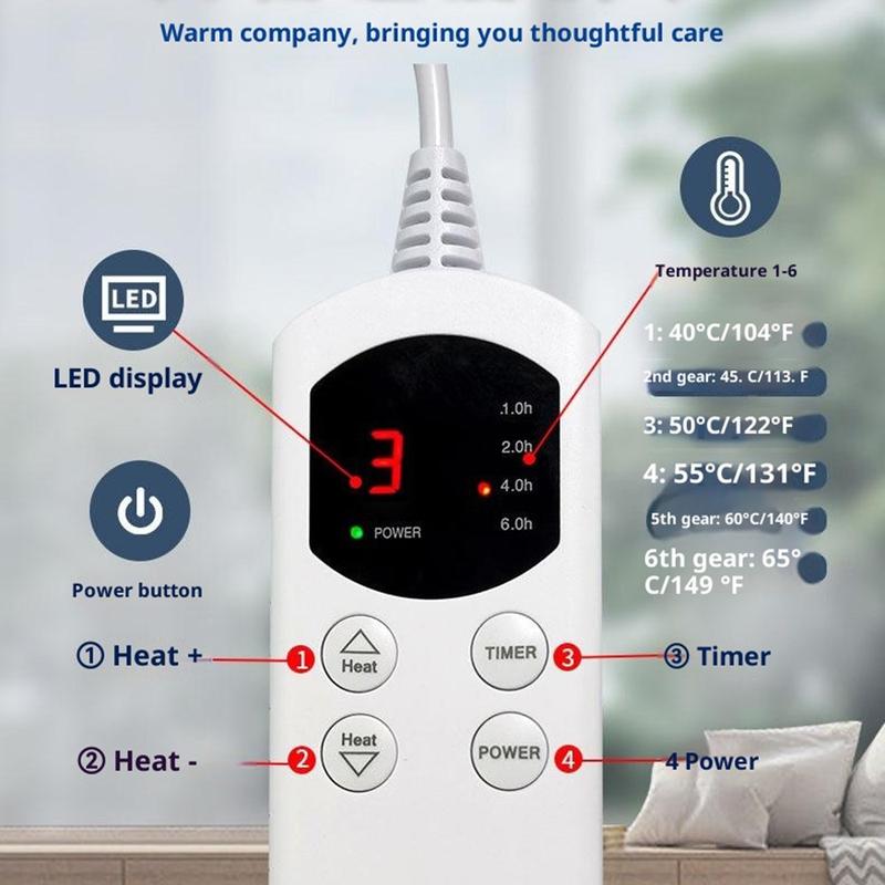 Personalizați-vă confortul cu șase setări de temperatură, variind de la 40 °C la 65 °C (104 °F - 149 °F). Controlerul intuitiv cu LED vă permite să alegeți intensitatea perfectă pentru nevoile dvs. în timp ce cele patru setări ale temporizatorului de oprire automată (1 h, 2 h, 4 h, 6 h) asigură siguranța și eficiența energetică în timpul utilizării prelungite.