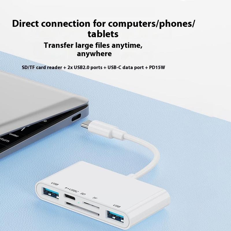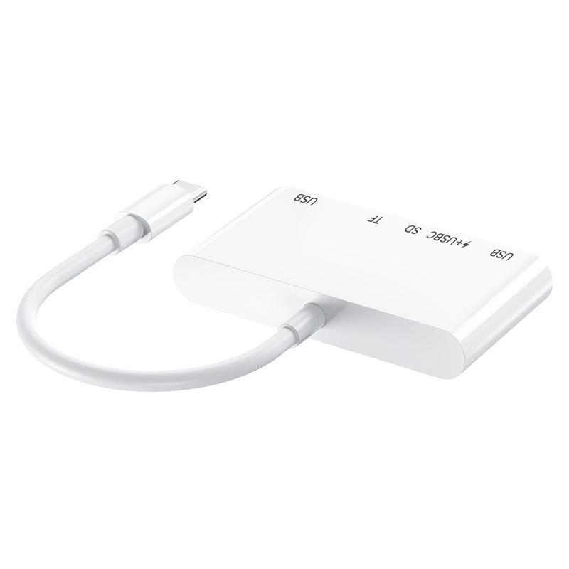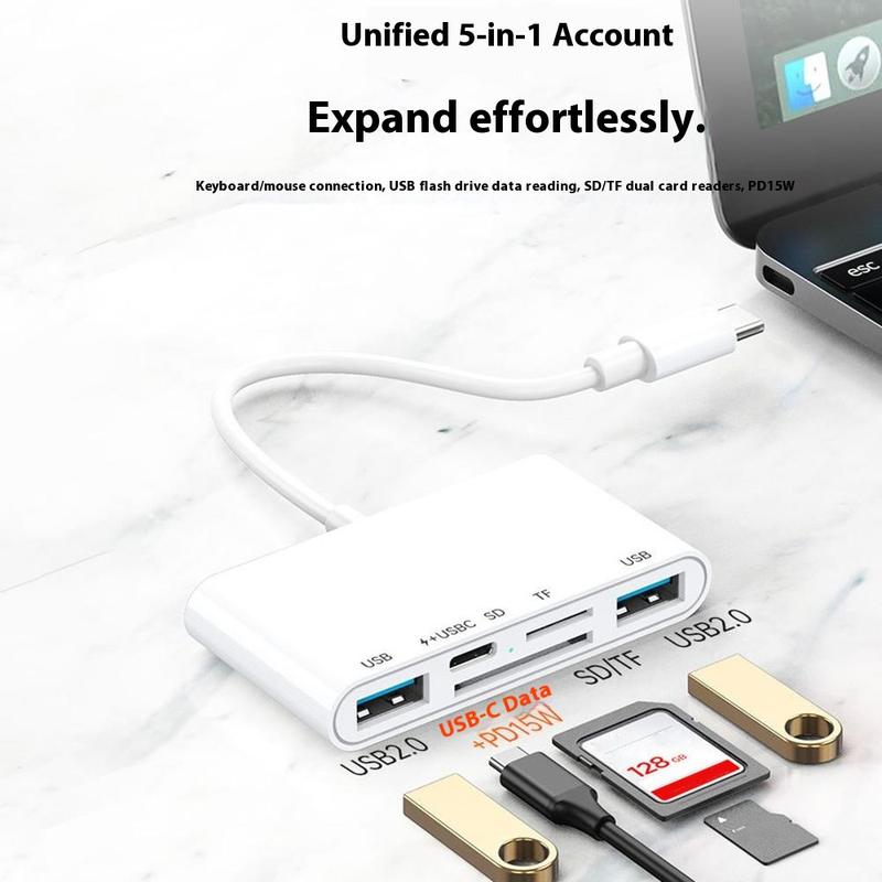 Adaptor 5-in-1 USB-C OTG - Hub USB-C cu două USB 2.0, încărcare PD 15W și cititor de carduri SD/TF pentru iPhone, MacBook și dispozitive USB-C