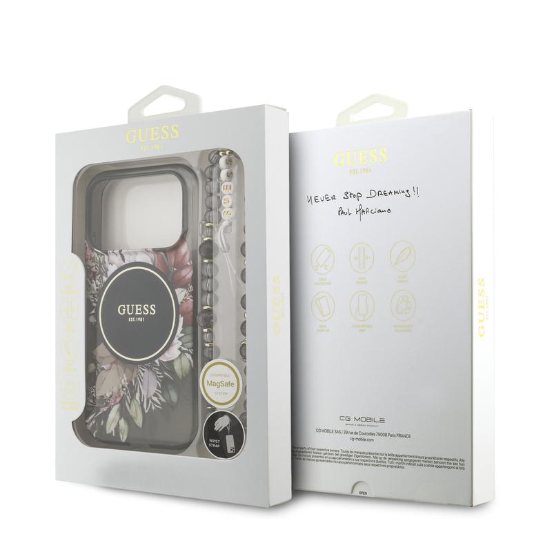Husă cu curea din perle Guess IML Flowers pentru iPhone 17 Pro - Carcasă protectoare elegantă compatibilă MagSafe cu curea de mână cu mărgele