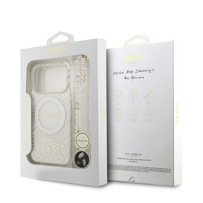 Husă cu curea din perle Guess IML Flowers Allover pentru iPhone 17 Pro - compatibil MagSafe